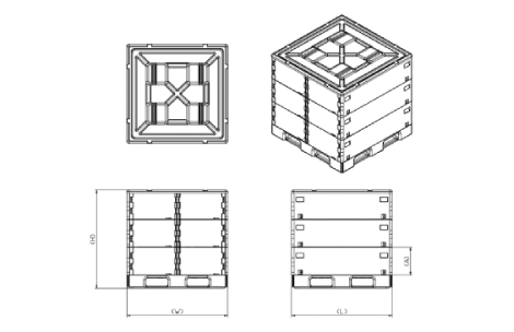 정면 사선 기타 수출입용 파렛트 포장용기 [STANDARD] 탄소중립 반복사용이 가능해 폐기로 인한 환경오염문제 개선 내구성 재질 특성상 습기에 강해 화물 보호에 최적화 편리성 접이식으로 공간활용 최적화. 잠금장치가 있어 별도의 밴딩 필요없음 규격 (단위 : mm) 품명 내측 사이즈 외측 사이즈 높이(H) 가로(W) 세로(L) 가로(W) 세로(L) 전체 다단 PLT 수출입용파렛트포장용기 1,036 1,036 1,100 1,100 1,098 310 150 실제 적용/납품 사례 목록